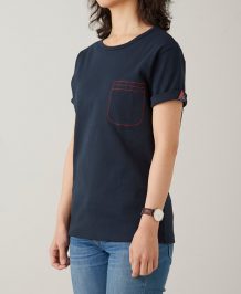 - ダブルの組織で編むことで、ハリ感と膨らみのある天竺素材を使用しています。適度な肉感ながらも清涼感があります。裏地に布帛生地を貼り付け、ポケットをステッチのみで表現したユニークなTシャツです。(実際にポケットはありません)左袖を捲るとワンポイントのワッペンが、着こなしのアクセントになります。